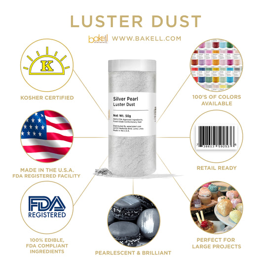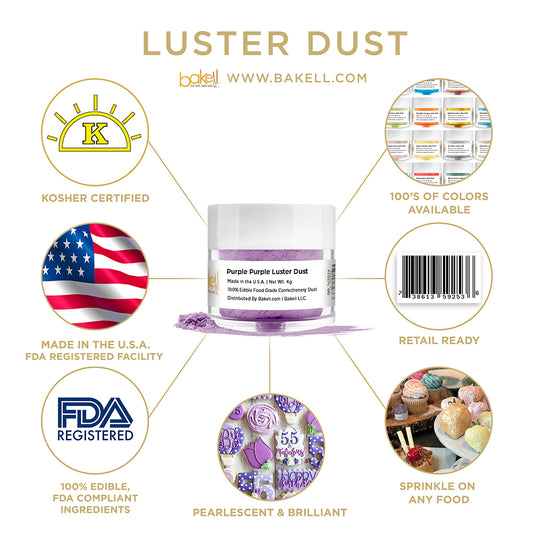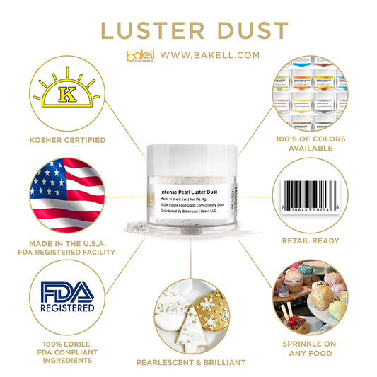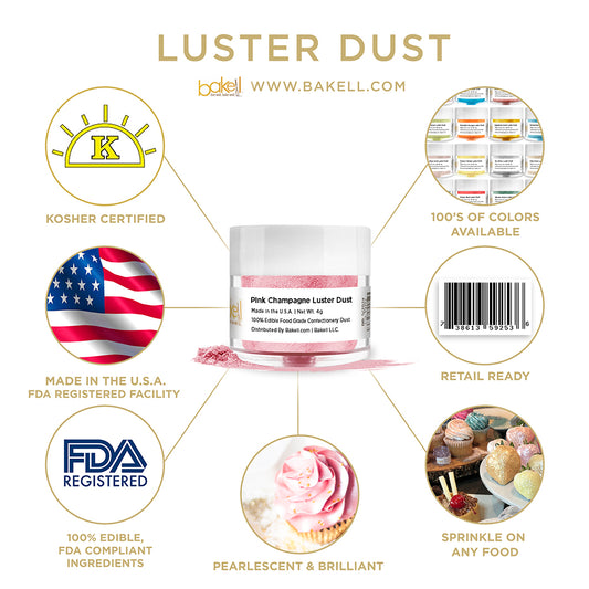 Tinker Dust edible glitter and Lustre Dust is made in the USA and manufactured in FDA registered & GMP certified facilities. Because our edible glitters use only FDA compliant & certified kosher ingredients allows cooks, bakers, pastry chefs and DIY decorators to know Bakell is committed to safety, high-quality products and a fun baking experience! No matter what type of bakery or kitchen you have — from a small family bakery to a large-scale commercial kitchen — our edible glitter for cakes, cookies, cupcakes, fruits, berries is the perfect sprinkle of magic that will make your desserts shine!