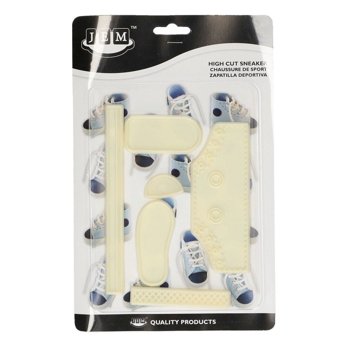 Create amazing high cut sneakers with this set of 6 easy to use cutters! Simply pop the cutters in your JEM roller pad, grease the cutters with JEM petal base, pop your paste over the top and roll your rolling pin over the back of the cutters to achieve neat, clean cut outs. The high cut sneakers are broken up into 6 separate parts and simply fit together to create effective 3d sneakers. Finished sneaker measures approx. 5cm x 7cm x 3mm.