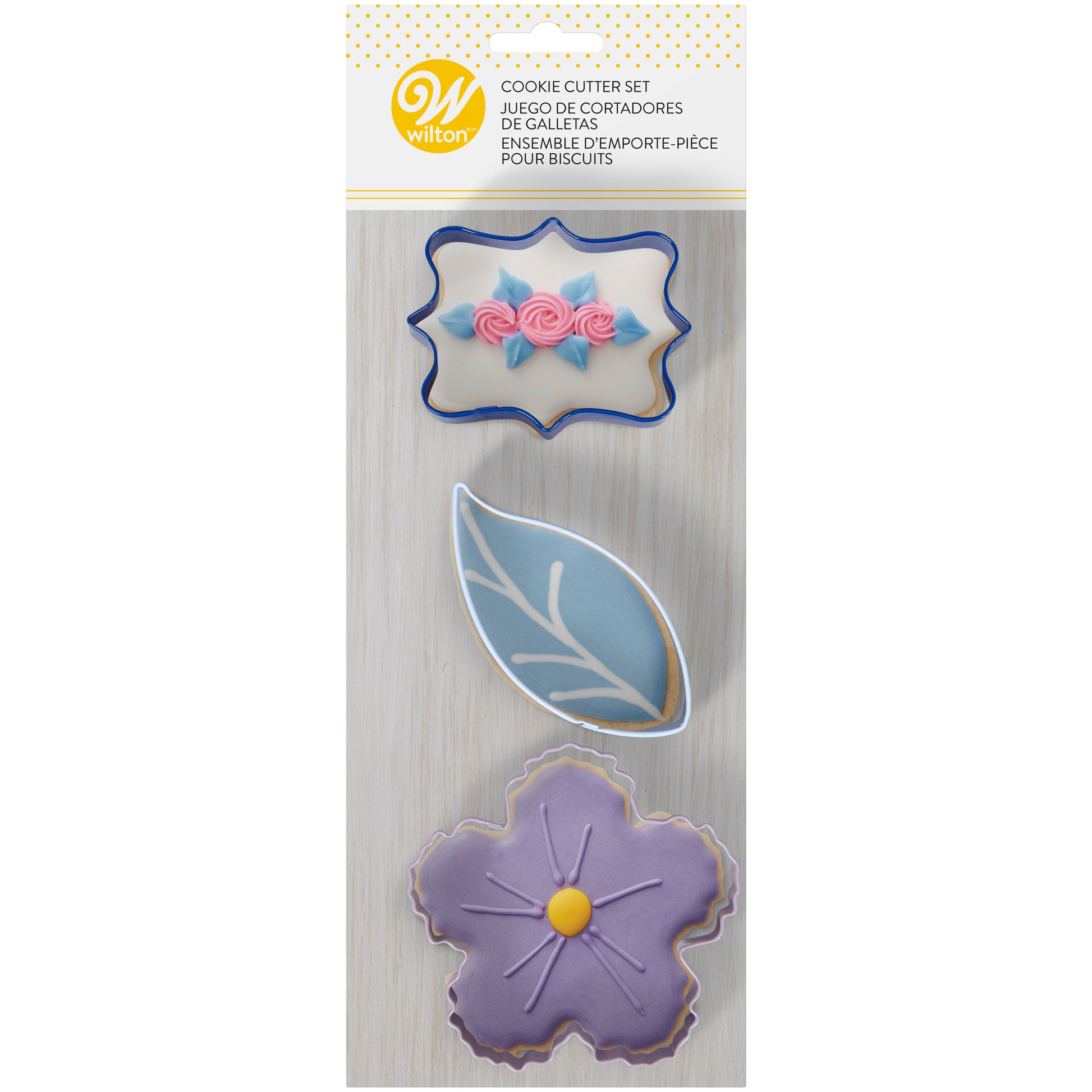 Handy three-piece cutter set from Wilton. Ideal for cutting out cookies or fondant decorations. Set includes a flower, petal and plaque cutter.