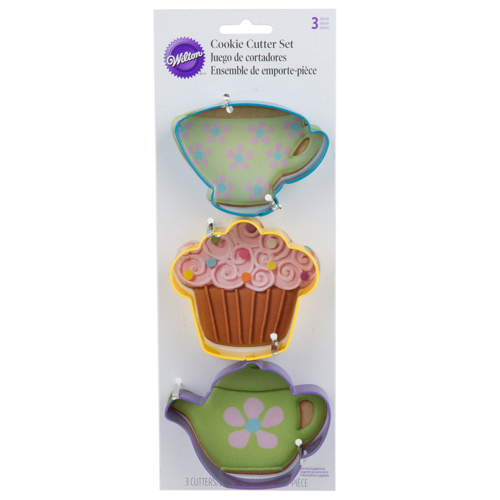Set of 3 cookie cutters. Metal colour-coated cutters. Tea Cup, Tea Pot and Cupcake.