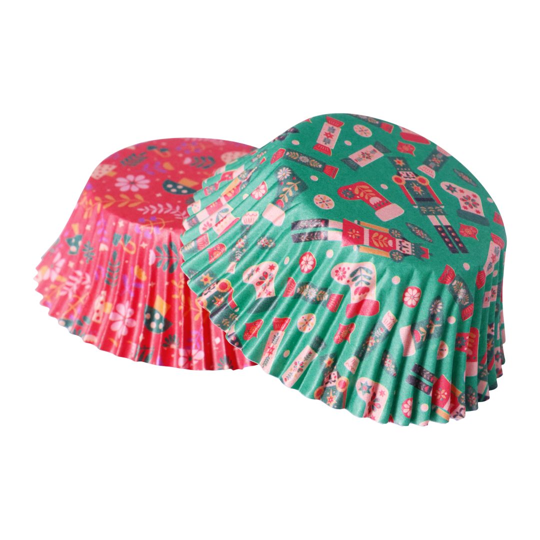 Set includes 2 designs x 12 baking cases of each, with 24 double-sided paper toppers. Features a Poinsettia & Mistletoe theme.