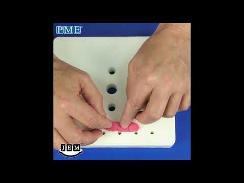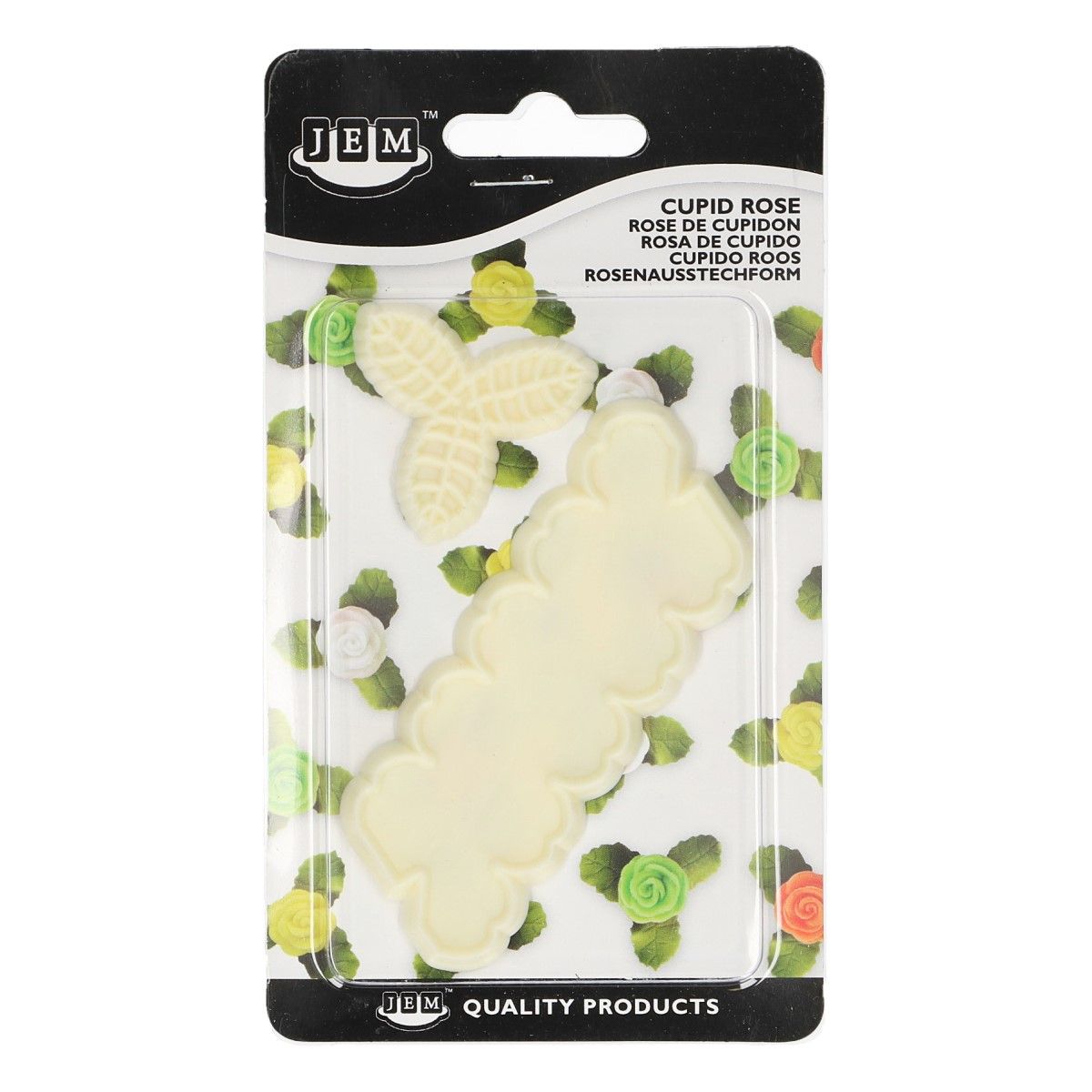 Set of 2 cupid rose cutters, perfect to create cut-outs to position on your cakes, cupcakes and cookies. Simply pop the cutters in your JEM roller pad, grease the cutters with JEM petal base, pop your paste over the top and roll your rolling pin over the back of the cutters to achieve neat, clean cut outs. The wiggly cut out is simple folded and rolled to create little roses that then can be placed into the centre of the leaves. Measurements - leaves 36mm (1 1/2 inches) and rose cutter 30 x 77mm (1 1/4 x 3 1/8 inches)