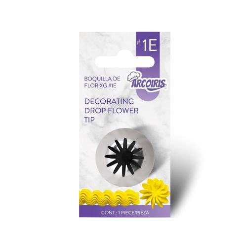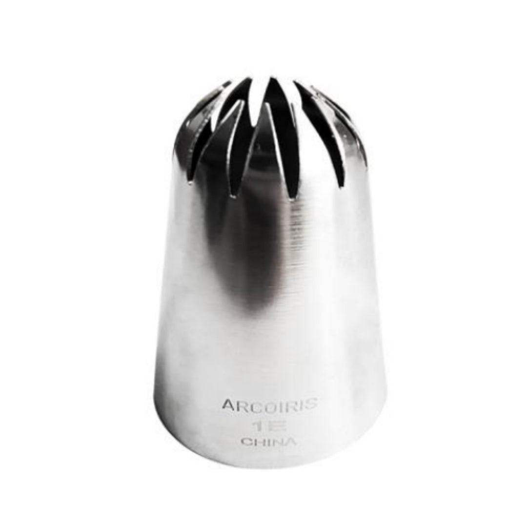 Create beautiful cake decorations with the Extra Large Drop Flower Tip #1E. This tip features a large size for creating large scale drop flowers and unique pull out stars for added detail. It also allows for easy creation of shell borders and reverse shells for even more creative options. Elevate your baking game with this versatile tip.