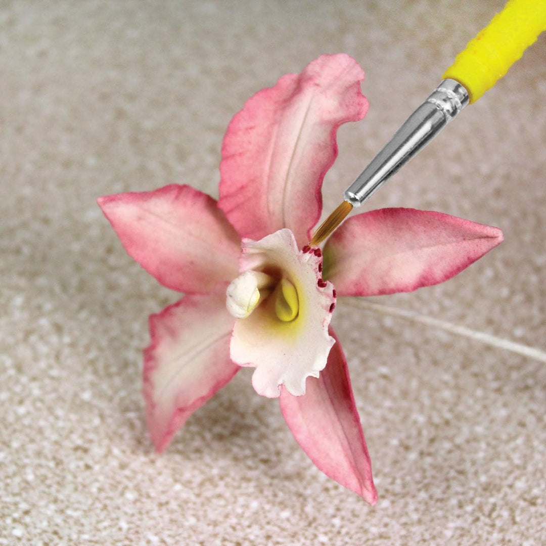 Set of 5 paint brushes to use with cake decorating projects. Great for using with edible glue, adding fine detail to your models or painting flowers, this pack will be an invaluable set to keep in your cake equipment cupboard. The brushes have durable nylon bristles and the clear handles have fitted rubber grips for greater control. Size: 2 brushes have 1mm wide tip 3 brushes have 2mm wide tip