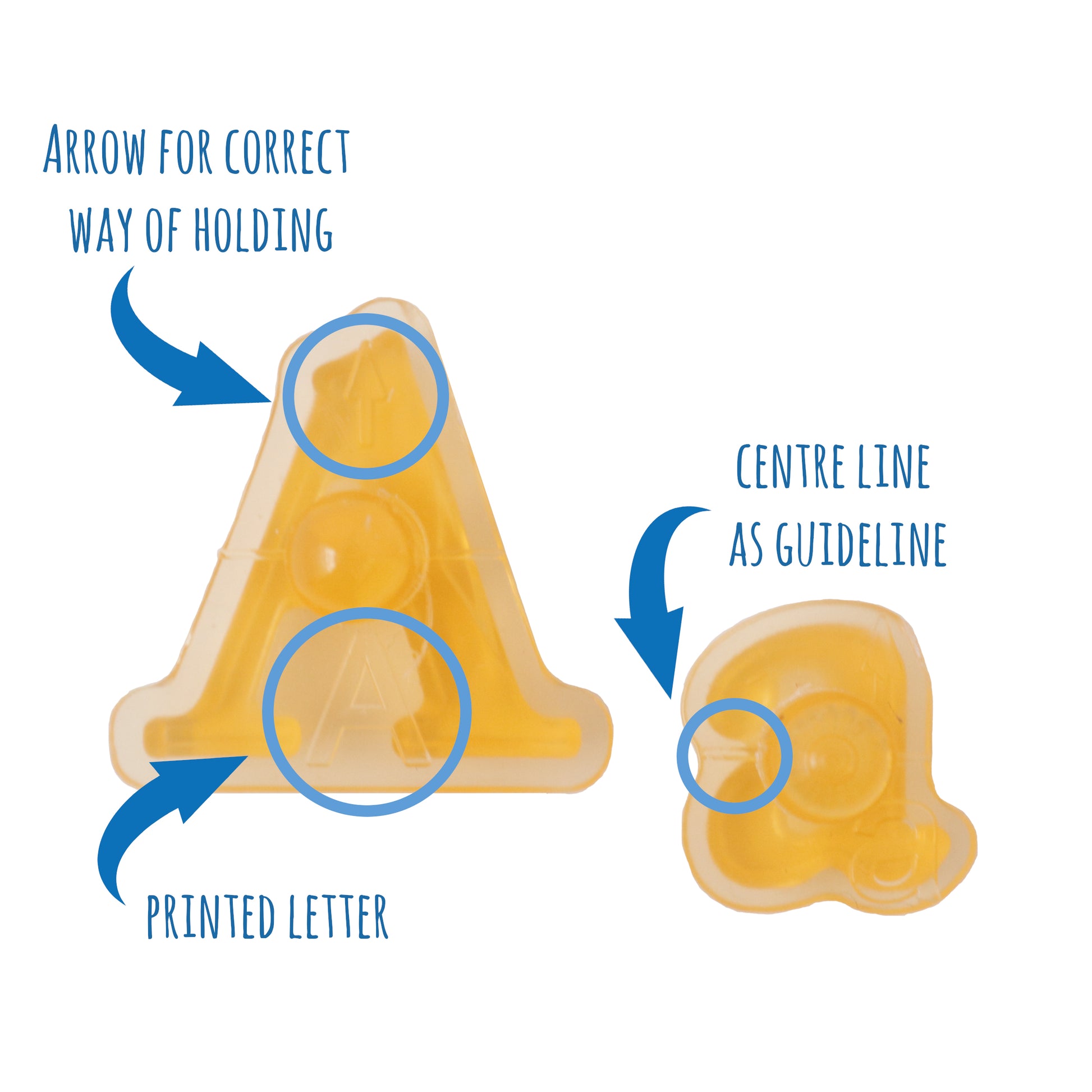 Reverse side of each stamp shows appropriate letter, difference between upper and lower case, directional arrow and a central line to assist with positioning.