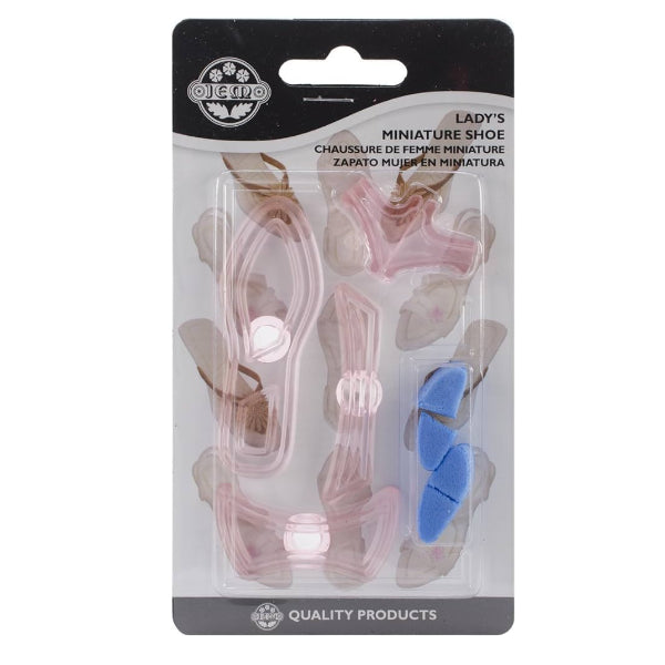 This 9-piece set comprises 4 foam Formers each measuring 10 x 14mm / 1/2 x 1/2 inch, and 5 plastic gum paste cutters. Cutter sizes are 88 x 42mm / 3-1/2 x 1-3/4 inch for the Sole, 82 x 50mm / 3-1/4 x 2 inch for the Upper, 96 x 69mm / 3-3/4 x 2-3/4 inch for the Ankle Strap, and 16 x 20mm / 3/4 x 3/4 inch for each of the 2 Heel Molds. Instructions included.