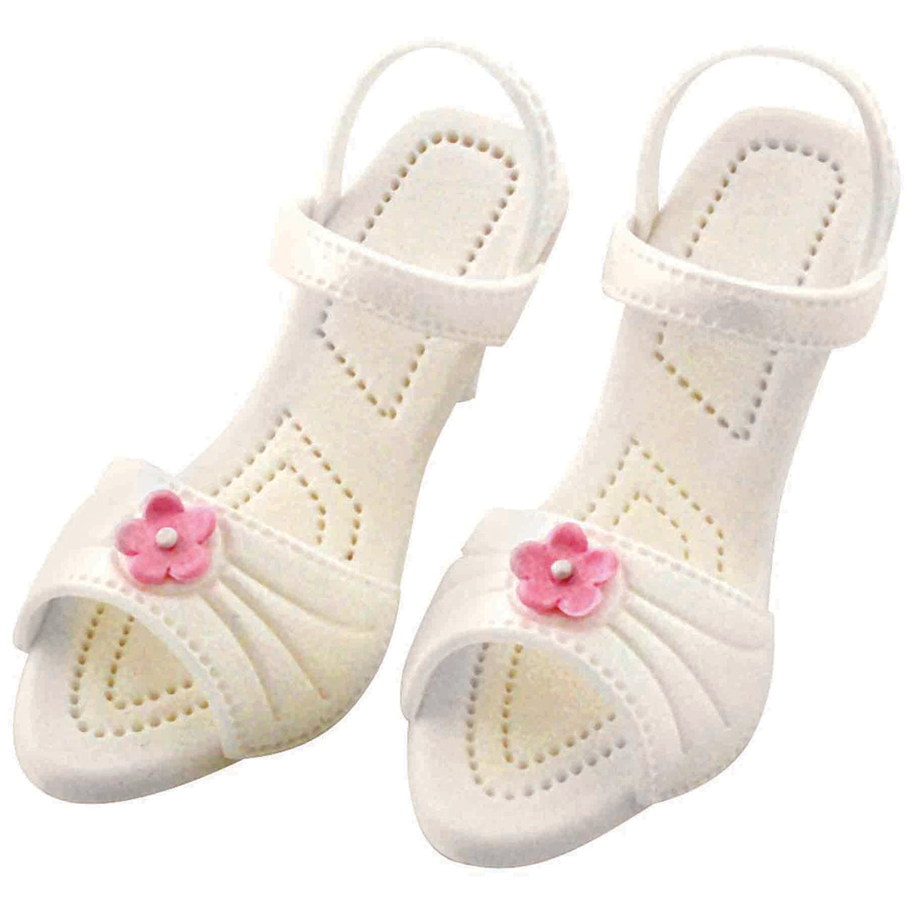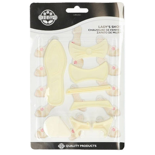 7 plastic gum paste cutters with 2 foam pads for upper former and heel former. Sizes are 87 x 42mm / 3-1/2 x 1-3/4 inch for embosser, 95 x 16mm / 3-3/4 x 3/4 inch for sole, 87 x 42mm / 3-1/2 x 1-3/4 inch for upper, 120 x 40mm / 4-3/4 x 1-1/2 inch for ankle strap and 85 x 6mm / 3-1/2 x 1/4 inch for back strap. Instructions on package.