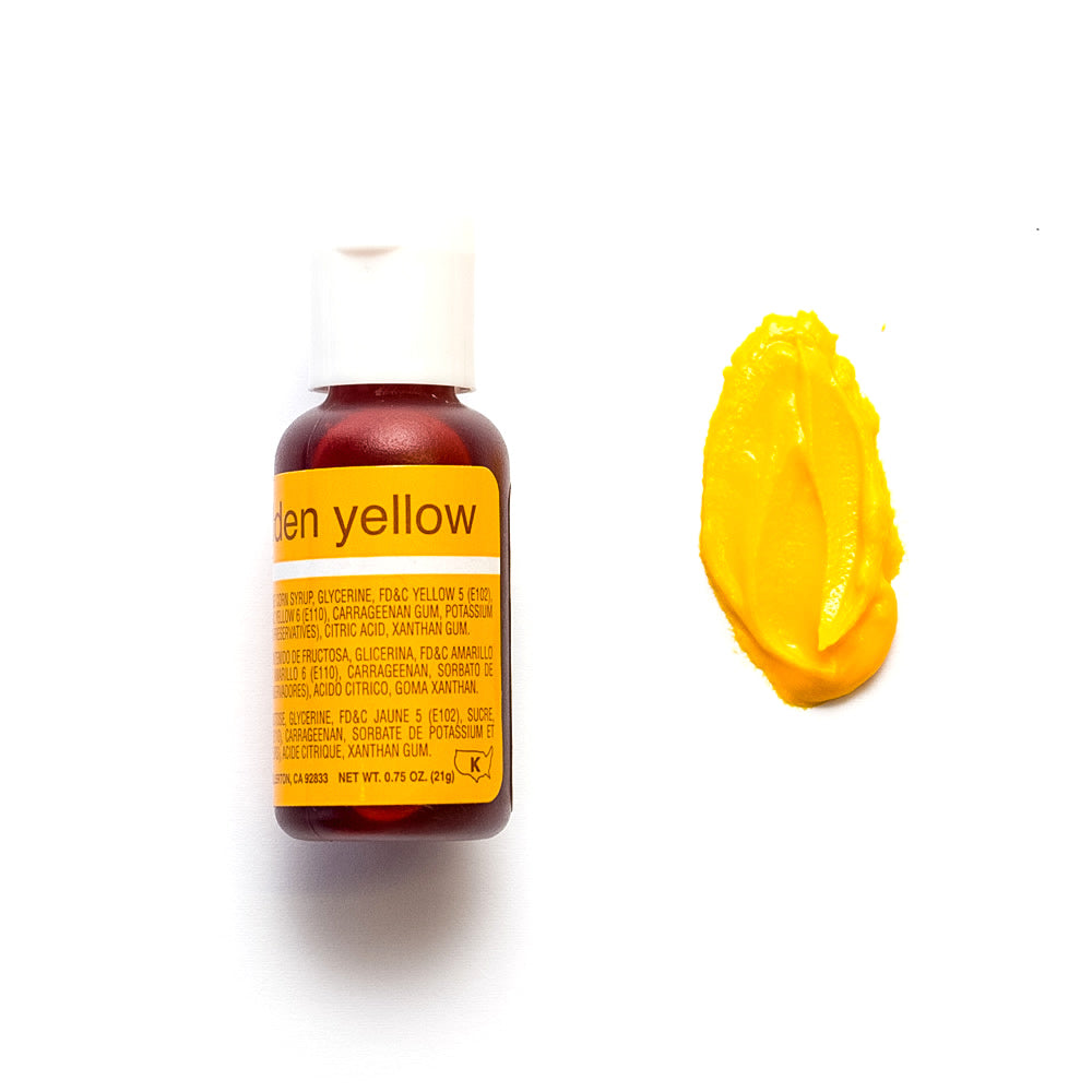 Chefmaster Golden Yellow Liqua-Gel Liquid Food Colouring is your go-to coloring to create a wide range of shades of warm orange-yellow with a slight brown undertone.