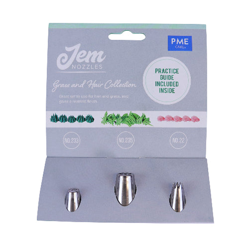 Set includes: Nozzle no. 233 - To create realistic grass for football-themed cakes and more; Nozzle no. 22 - Use to pipe swirls and shells with various mediums, Nozzle no. 235 - Create realistic looking hair for cakes.