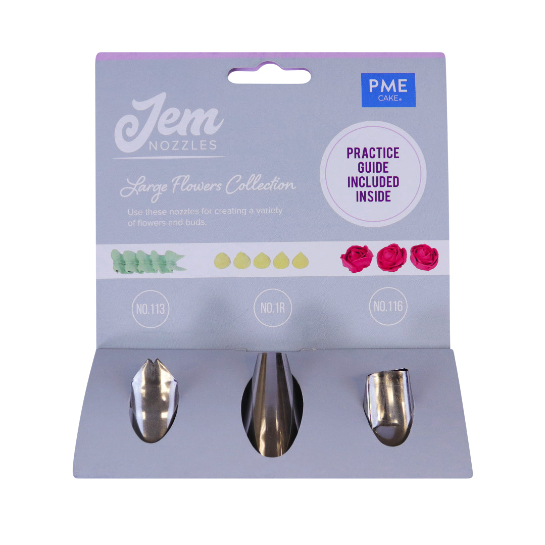 Set includes: Nozzle no. 113 - Pipe leaves for any flower design. Pipe back and forth to create a fancy ribbon effect; Nozzle no. 116 - Create a single petal border or pipe a beautiful rose; Nozzle no. 1R - Pipe buds and lines to enhance flowers.