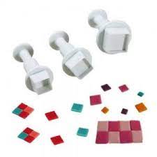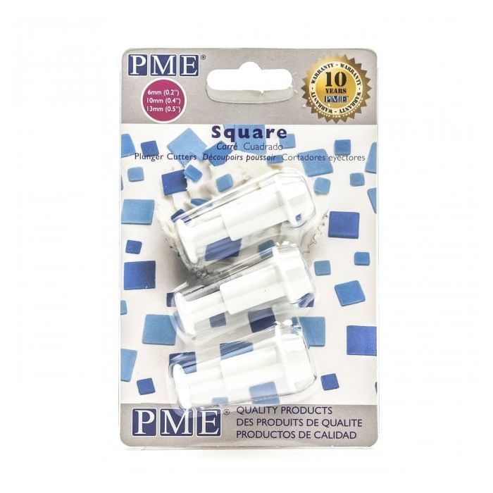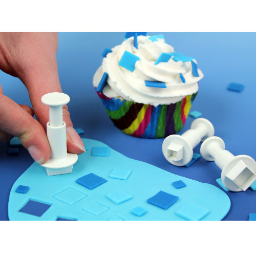 This Set of Square Plunger Cutters is ideal for use with a wide range of edible and non-edible materials including: Sugar paste (rolled fondant), petal paste (gum paste), marzipan, craft clays and much more. Dimensions: Small 6 mm (0.2") Medium 10 mm (0.4") Large 13 mm (0.5")