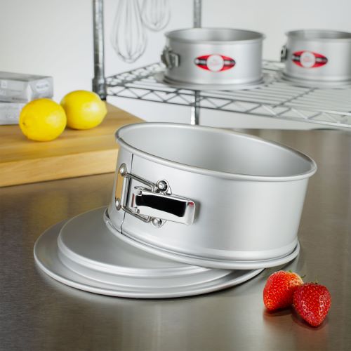Bake your cheesecake and specialty desserts for wedding, birthday and holiday celebrations with Fat Daddio's ProSeries Springform Cake Pans. Designed for delicate desserts when the top needs to be preserved and cannot be easily transported, these pans are also ideal for any cake batters, upside-down cakes, streusel-topped cakes, pizzas, quiches and frozen desserts. 3" depth allows for topping with fruit or streusel in the pan after baking. Simply flip the latch to release the pan and serve on removable base. Seamless and straight-sided. Rolled rim for easy-handling. Safe for citrus-based foods. Built to last through daily use in both the home kitchen and commercial establishments. Commercial stainless steel buckle and removable, pedestal-style base. Easy release and clean up. Heats faster and cools quicker. Even heating - NO hot spots! Will never rust, peel or flake. No extra metals, chemical additives, dyes, PTFE’s or PFOA’s. 18-gauge anodized aluminum. Temperature-rated up to 550° F (285° C) Pressure cooker and air fryer safe. Freezer safe. Hand wash recommended. Lifetime warranty.