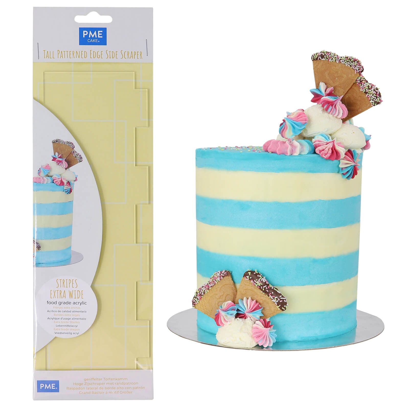 Make a beautiful buttercream cake with a extra wide stripes pattern using one side or a smooth edge using the other side with this handy tall scraper from PME. The smooth side can also be used to smooth the tops of your cake. The PME tall pattern wide stripe edge side scraper is also suitable to use with royal icing or whip cream. Made of food grade acrylic. Size : 10" x 3 1/8" / 7.94 x 25.4 cm.