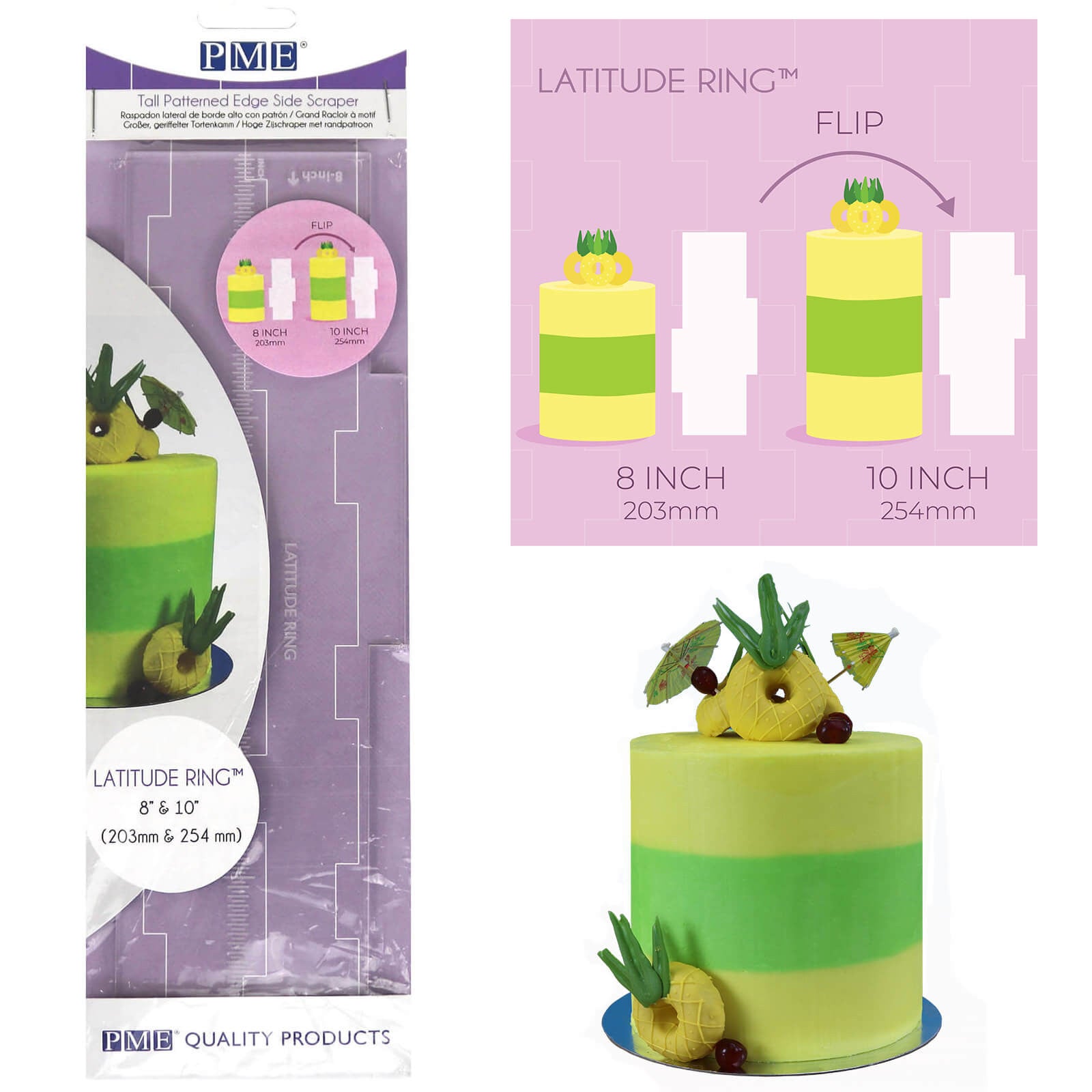 Make a beautiful buttercream cake and take out the centre third of your cake using one side of the latitude ring or flip the scraper to the other side to change heights. Perfect for your 8" / 20.3 cm and 10" / 25.4 cm tall cakes. The PME tall pattern side scraper is also suitable to use with royal icing or whip cream. Made of food grade acrylic. Size : 10" x 3 1/8" / 7.94 x 25.4 cm