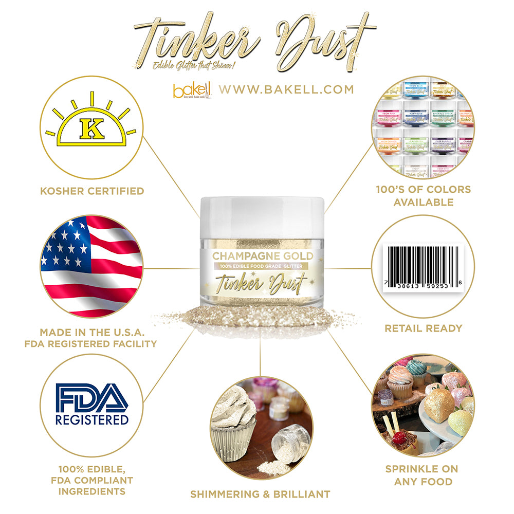 Tinker Dust is a very potent, shiny, edible glitter-dust used for cake & cookie decorating, confectionery crafts & baking! We use only FDA approved ingredients so these dusts are 100% consumable. These shiny sparkle dusts have a silky texture & use only edible food grade and food safe ingredients!
