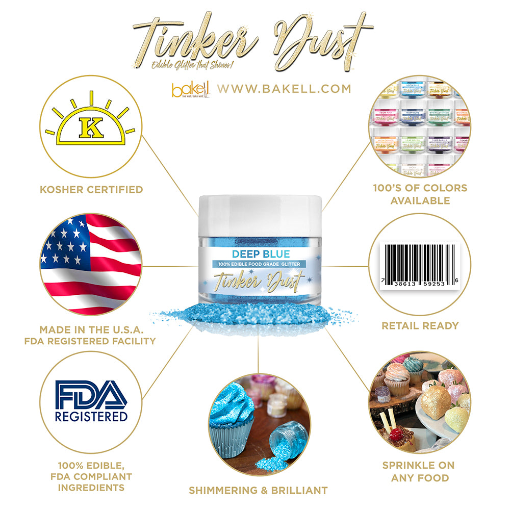 Tinker Dust is a very potent, shiny, edible glitter-dust used for cake & cookie decorating, confectionery crafts & baking! We use only FDA approved ingredients so these dusts are 100% consumable. These shiny sparkle dusts have a silky texture & use only edible food grade and food safe ingredients!
