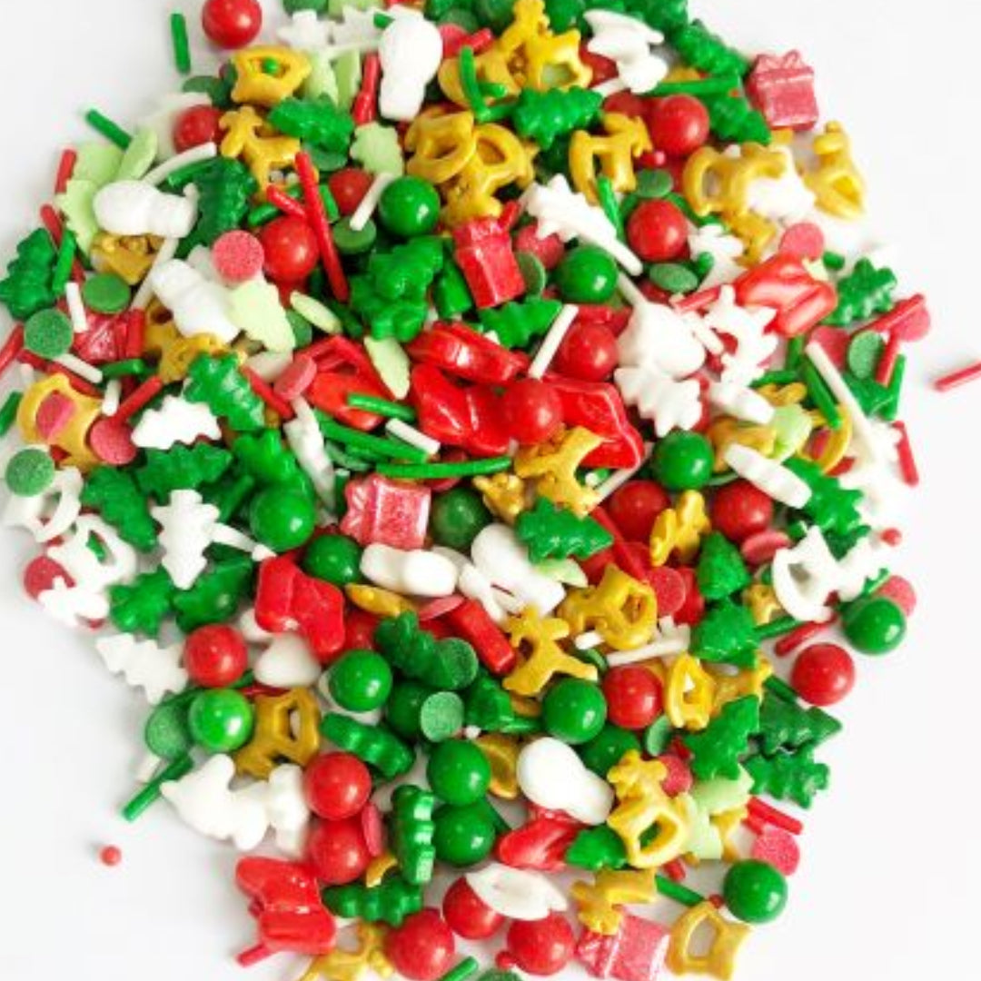Experience the festive cheer with our Reindeer & Trees Mix! Green trees and gold and white reindeer embellished with jimmies, confetti, presents, and pearls make for a perfect holiday treat. Our mix brings together the best of the Christmas season, adding a touch of magic to any dessert.